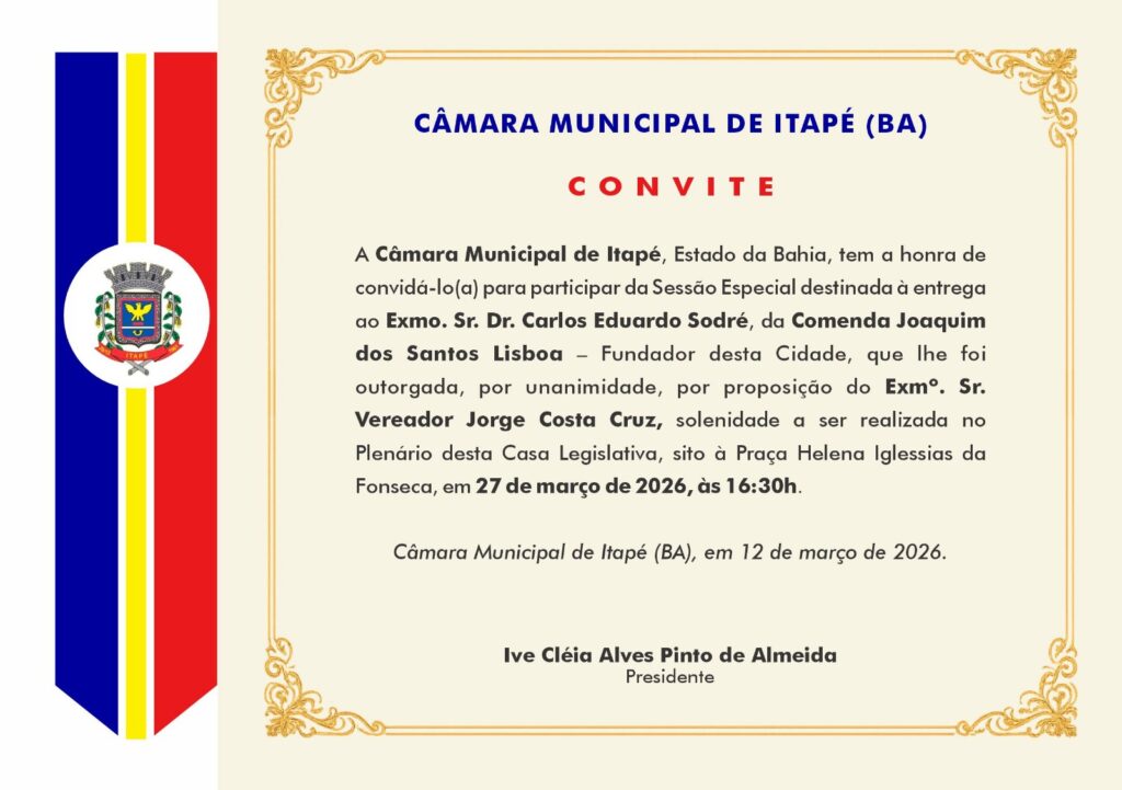 A Câmara Municipal de Itapé realizará, no próximo dia 27, uma sessão especial para homenagear o itapeense Carlos Sodré com a “Comenda Joaquim Santos Lisboa – Fundador da Cidade”. Ele será o primeiro a receber a honraria, concedida em reconhecimento aos relevantes serviços prestados ao município e à causa pública brasileira.